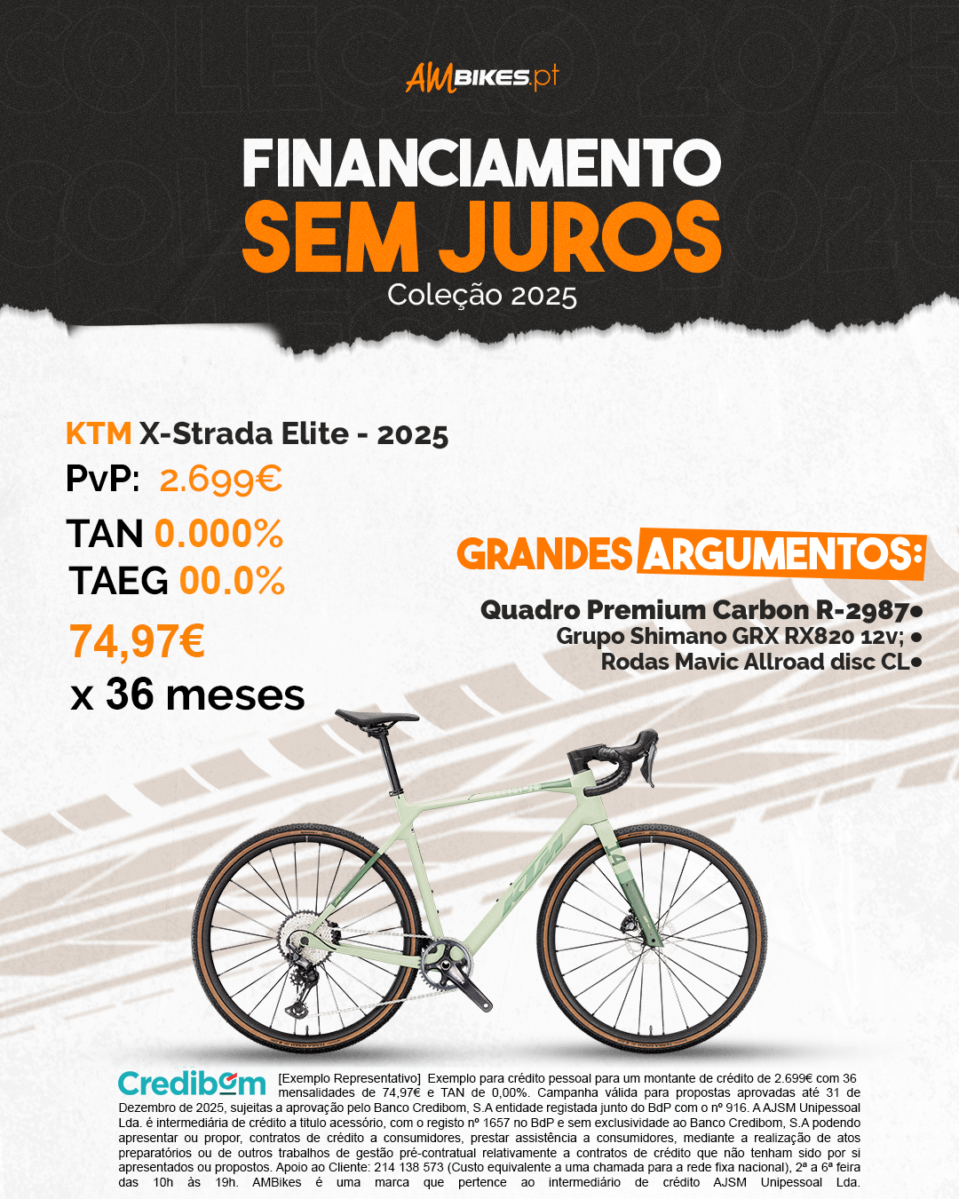 [Exemplo Representativo] Exemplo para crédito pessoal para um montante de crédito de 2699€ com 36 mensalidades de 74,97€ e TAN de 0,00%. Campanha válida para propostas aprovadas até 30 de setembro de 2025, sujeitas a aprovação pelo Banco Credibom, S.A entidade registada junto do BdP com o nº 916. A AJSM Unipessoal Lda. é intermediária de crédito a titulo acessório, com o registo nº 1657 no BdP e sem exclusividade ao Banco Credibom, S.A podendo apresentar ou propor, contratos de crédito a consumidores, prestar assistência a consumidores, mediante a realização de atos preparatórios ou de outros trabalhos de gestão pré-contratual relativamente a contratos de crédito que não tenham sido por si apresentados ou propostos. Apoio ao Cliente: 214 138 573 (Custo equivalente a uma chamada para a rede fixa nacional), 2ª a 6ª feira das 10h às 19h. AMBikes é uma marca que pertence ao intermediário de crédito AJSM Unipessoal Lda.